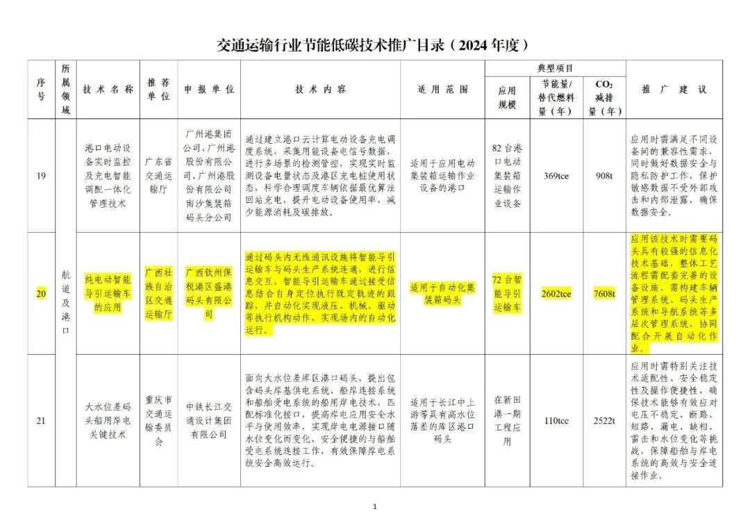 近期,交通運(yùn)輸部發(fā)布《交通運(yùn)輸行業(yè)節(jié)能低碳技術(shù)推廣目錄(2024年度)》,涵蓋公路、航道及港口、道路運(yùn)輸、船舶運(yùn)輸?shù)阮I(lǐng)域共27項(xiàng)先進(jìn)適用的節(jié)能低碳技術(shù)。由北部灣港集團(tuán)旗下廣西欽州保稅港區(qū)盛港碼頭有限公司申報(bào)的《純電動(dòng)智能導(dǎo)引運(yùn)輸車(chē)的應(yīng)用》入選,成為廣西唯一入選推廣目錄的技術(shù)應(yīng)用。